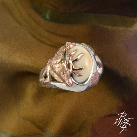 We offer men’s & ladies’ rings with our elk ivories or with the customers provided ivories. Our customers can be sure that we fit our setting to their ivories, not the other way around. Our rings show sculptural designs that are unafraid of depth and uncompromising on the subject which we wish to focus on. Roger's men's rings combine the ancient human history of hunting of the elk while Ildiko places the ivories into settings that are attractive in design. Every piece requires unique hand shaping that make each item a multi-layered dimensional creation. Two major catagories are apparent in the designs: 1)the ivory is either in a bezel setting, or 2) the elk rack serves as a prong setting that holds the ivory in place. In an extra step we take to ensure comfortable wearing of the ring, these prongs are also painstakingly countersunk into the ivory on men's rings, to prevent snagging.